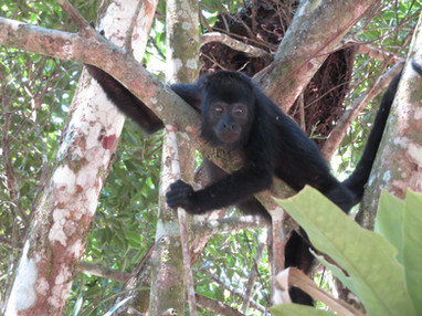 In our jungle paradise, we have lots of birds, lizards, bugs, and occasional howler monkeys. The monkeys seem to always travel right outside our resort, high in the trees. When we hear them, we always go to where we can watch them. The day after our fellow campers departed, we had a surprise visit by 7 of the monkeys. They came right to the trees in our campground. We started watching them at 9:30 am and they didn’t leave until about 4 pm. They took a siesta from 12 pm-2 in the big tree in the corner of the campground. When they woke up, the monkey show began- Bigger and Better than the morning show! They didn’t stay in the big tree. All of them eventually make their way to the smaller ficus tree right across from our trailer. As we watched them come over, one by one, we noticed something very interesting. One monkey started to Pee and directly after that Pooped. Sending glorious Monkey Bombs to the ground below. Each monkey took its turn. I was taking pictures (let me know if you want to see the ones with the monkey pooping), when I felt a splash behind me hitting my calves. There was a sneaky monkey right over my head. I had to scramble to avoid the oncoming glorious Monkey Bombs! Oh my!! Some monkeys pooped and peed twice. One monkey peed on our chair before we could move it. Then I realized they were aiming for us! Or at least our stuff. They put on a great monkey show.