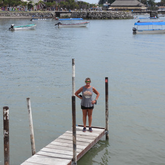 We walked out on a small pier that literally went nowhere... just into some trees. We made a spectacular discovery there. We watched a brilliant green hummingbird building a nest! I got a few pictures of her. We are planning on going back again to check on her babies. We found some chickens and ducks on the beach that someone was keeping there. Larry picked up a baby chick for a quick second as the mom watching was keeping an eye on him. We also found a donkey tied up on the beach next to his hut. Very interesting place. We found the little restaurant that our friends described and decided it was time for a beer and snack. It was called La Cabana.