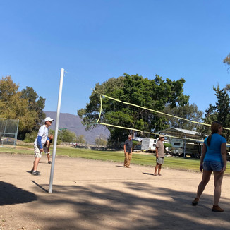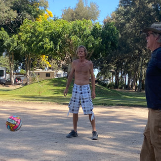At about 3 pm, we started gathering our volleyball players. Deb said she would be our cheering section and brought her chair and beer. We got Robin to walk over to the courts and invited Max too. Max tried to get us to just play on the soccer field but I shut him down! No Max…..I am beginning to know how this guy works. We knew Carol and Marvin were not players but asked their kids John and Stephanie if they would like to come. Just as we were gathering, Eduardo came up on his bike and he was geared for the competition! Game on! I played for about 3 minutes until the good folks were all assembled and then sat with Deb to drink beer! At first, it looked a bit painful until everyone got into a groove.